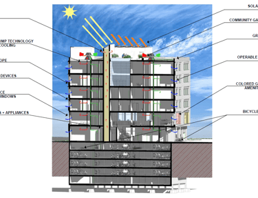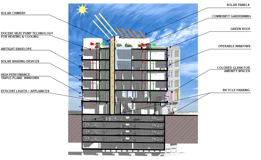 This diagram highlights the building’s core sustainability strategies, including a high-performance airtight envelope, triple-glazed operable windows with solar shading, efficient heat pump systems, and a solar chimney for natural ventilation. Solar panels, a green roof, and community gardening further support energy efficiency, comfort, and sustainable student living.