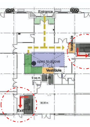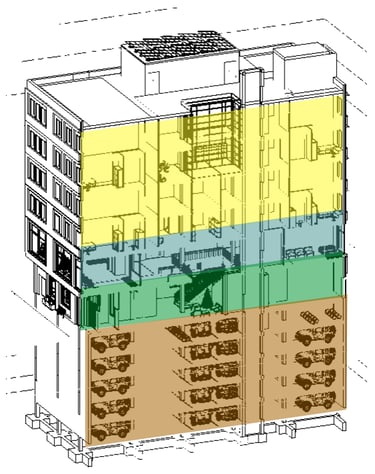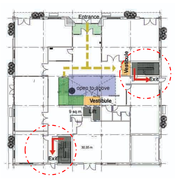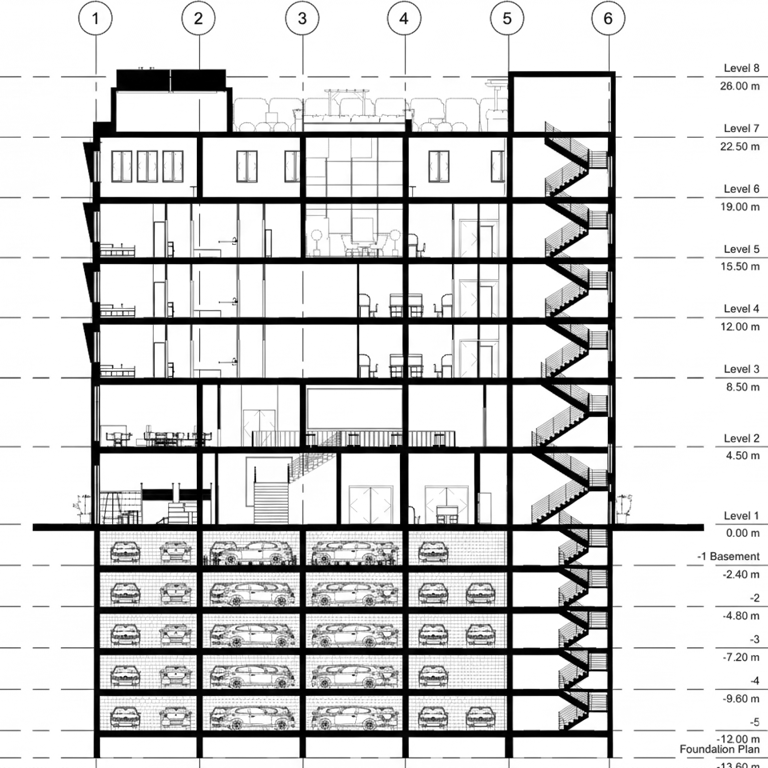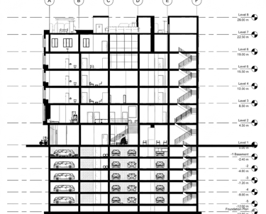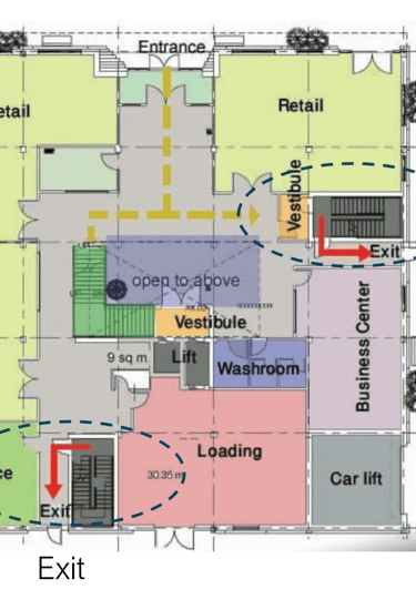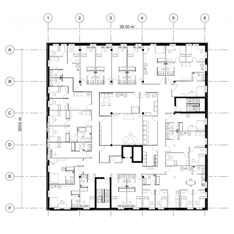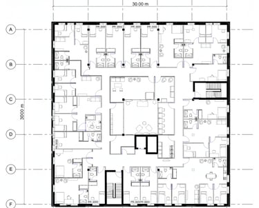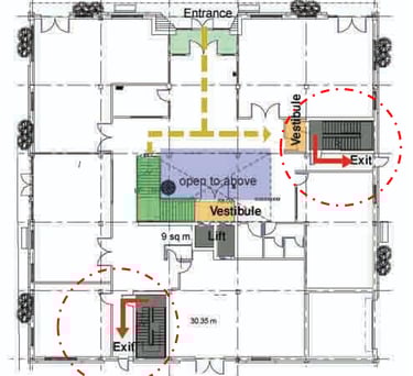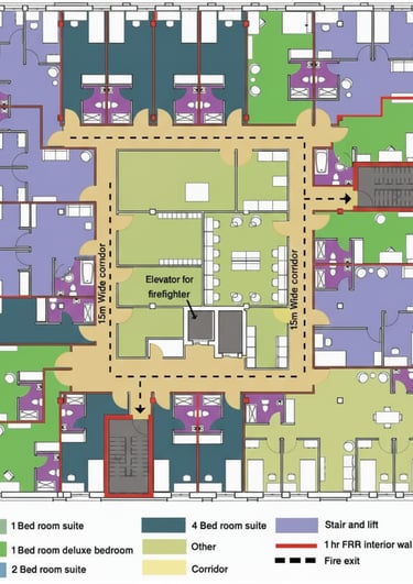 This project is a six-storey mixed-use student residence designed in compliance with the latest edition of the Ontario Building Code (OBC). The building code analysis addresses life safety requirements with a focus on means of egress, occupant load, fire-resistance-rated separations, and exit configuration. A looped corridor system provides continuous access to multiple exits, while exit stairs are separated by fire-rated vestibules to enhance safety and code compliance. Egress widths for corridors, stairs, and doors are calculated based on OBC factors and coordinated with the architectural layout to ensure clear, efficient, and compliant evacuation routes throughout the building.