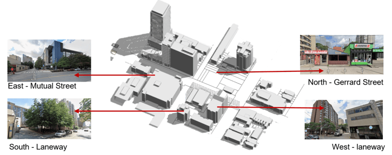 North (Gerrard St.): 2 m minimum for the ground floor; 1 m minimum for all upper floors