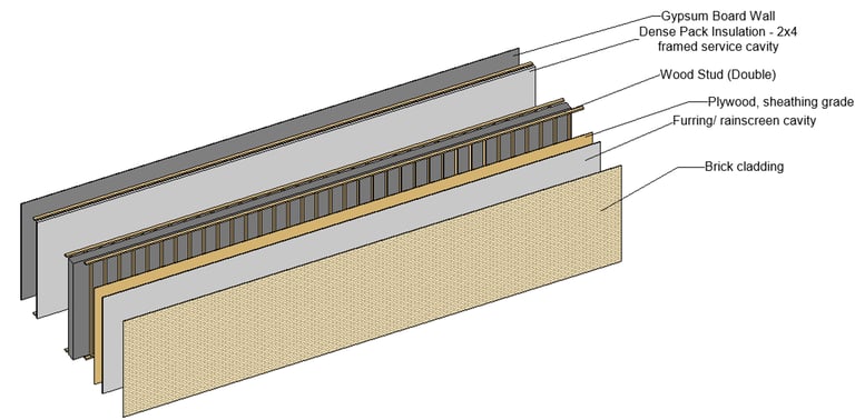 Two separate stud walls (inner + outer) create a deep insulation cavity